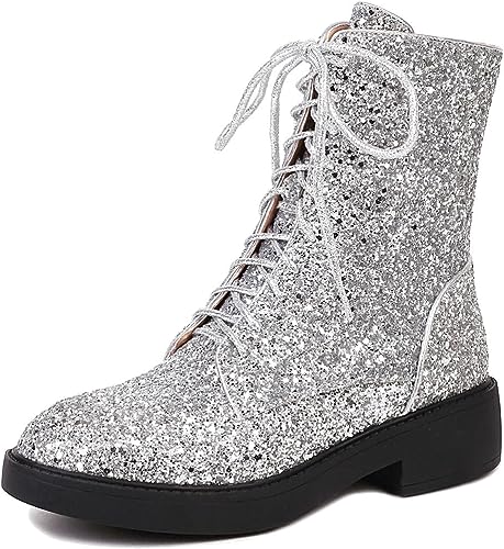 Lace Up Glitter Sequin 4cm-silver Combat Boots
