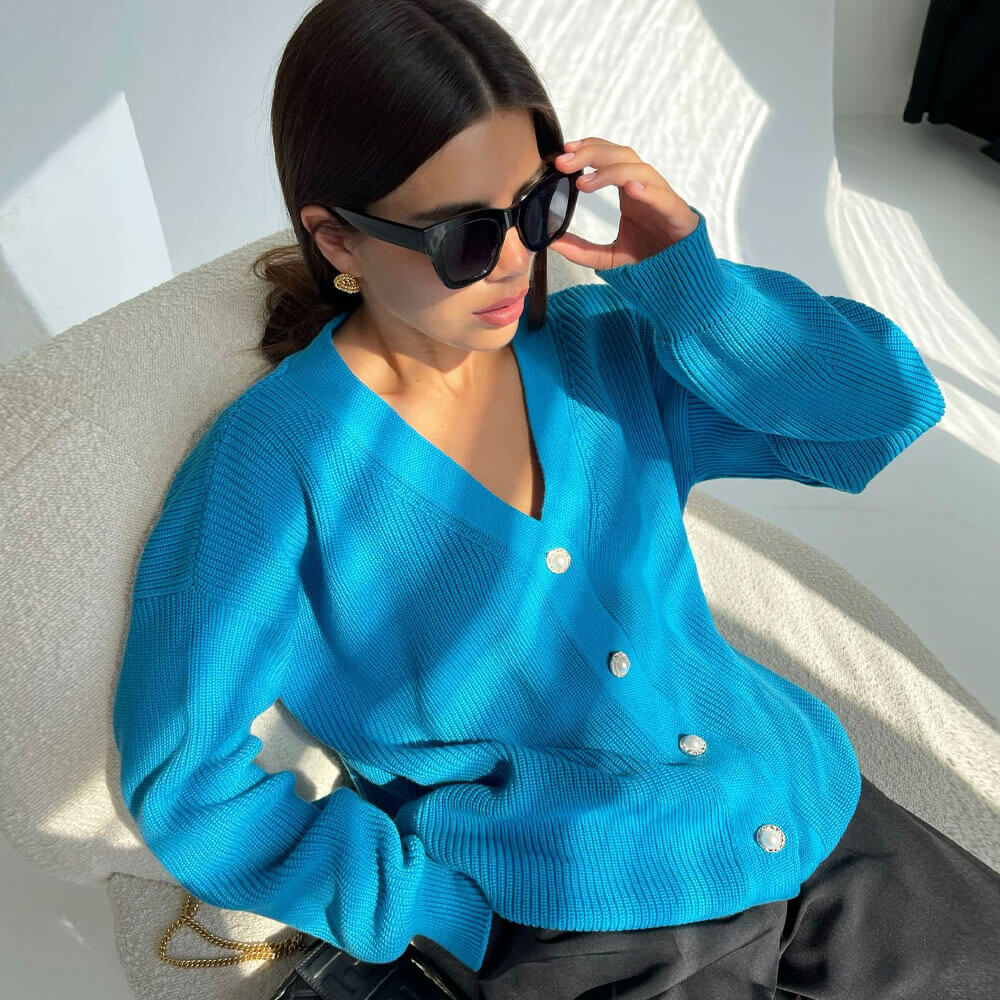 Another expensive-looking winter textured cardigan in a longline design. Made of soft acrylic blend fabric. this pure color buttoned knitwear features a V-shaped neckline with a button placket at front. a relaxed silhouette along with dropped-shoulder long sleeves in an extra extended length. Button-up as a knit top in fall or unbutton as an outer layer with a warm turtleneck pullover. If you want a chic winter outfit. style it with our pleated wide leg knit pants that's a bit elevated.