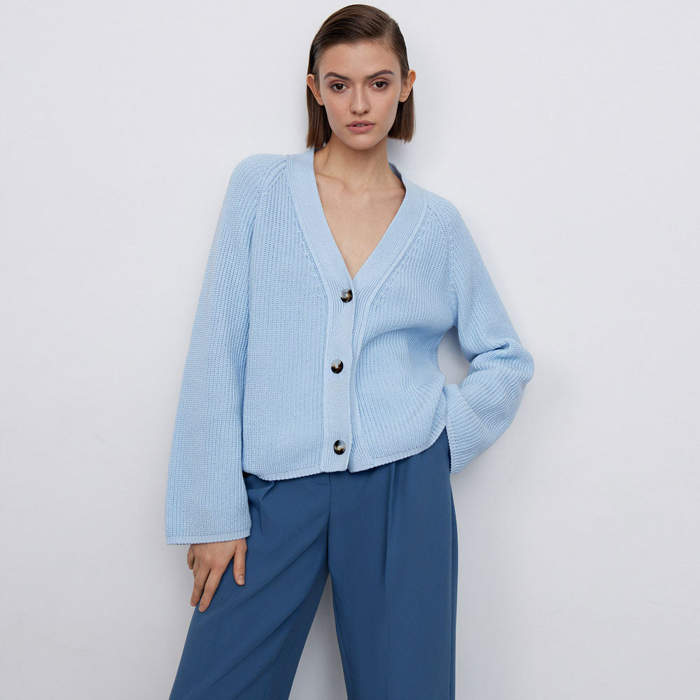 Cozy meets textured in this expensive-looking winter cardigan. Made of soft acrylic blend fabric. this pure color buttoned knitwear features a V-shaped neckline with a button placket at front. a roomy silhouette along with raglan sleeves in a slightly short length. Button-up as a knit top in fall or unbutton as an outer layer with a warm turtleneck pullover. If you want a chic winter outfit. style it with our pleated wide leg knit pants that's a bit elevated.