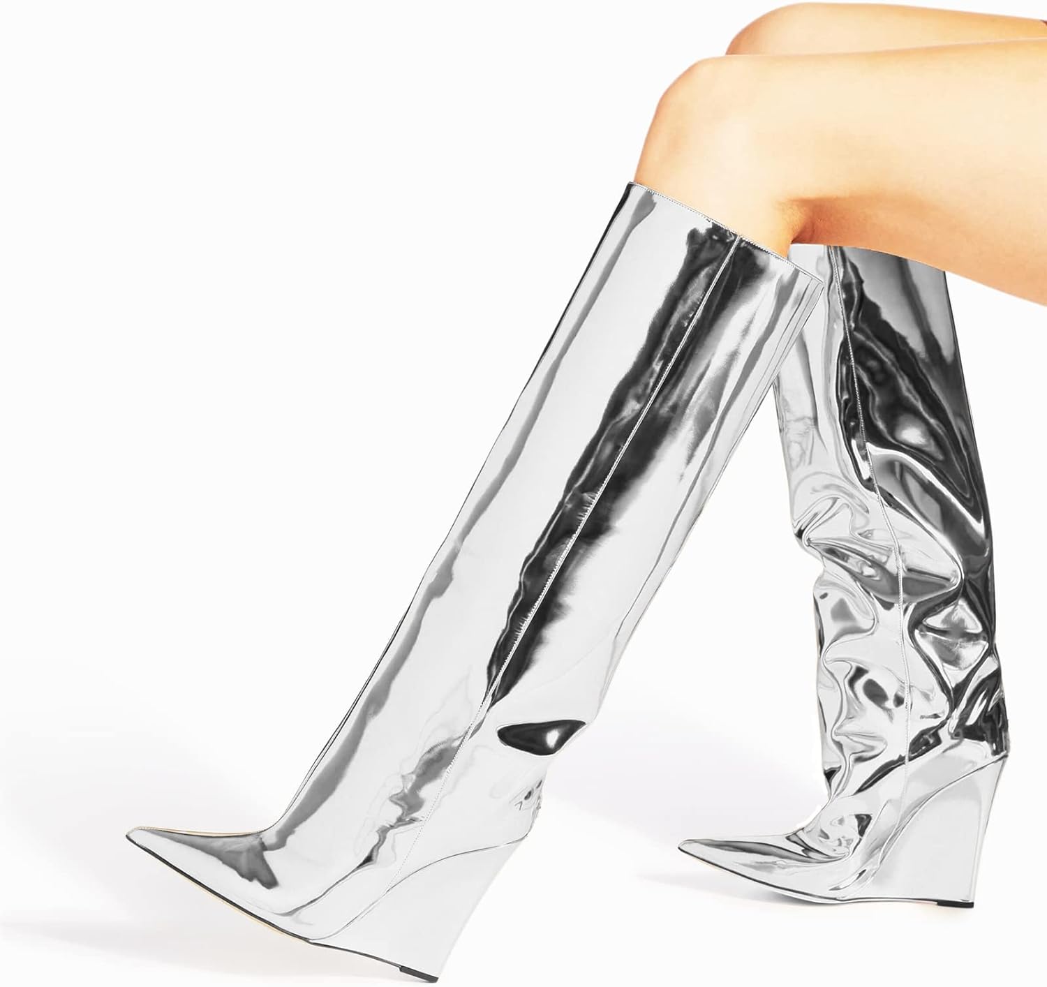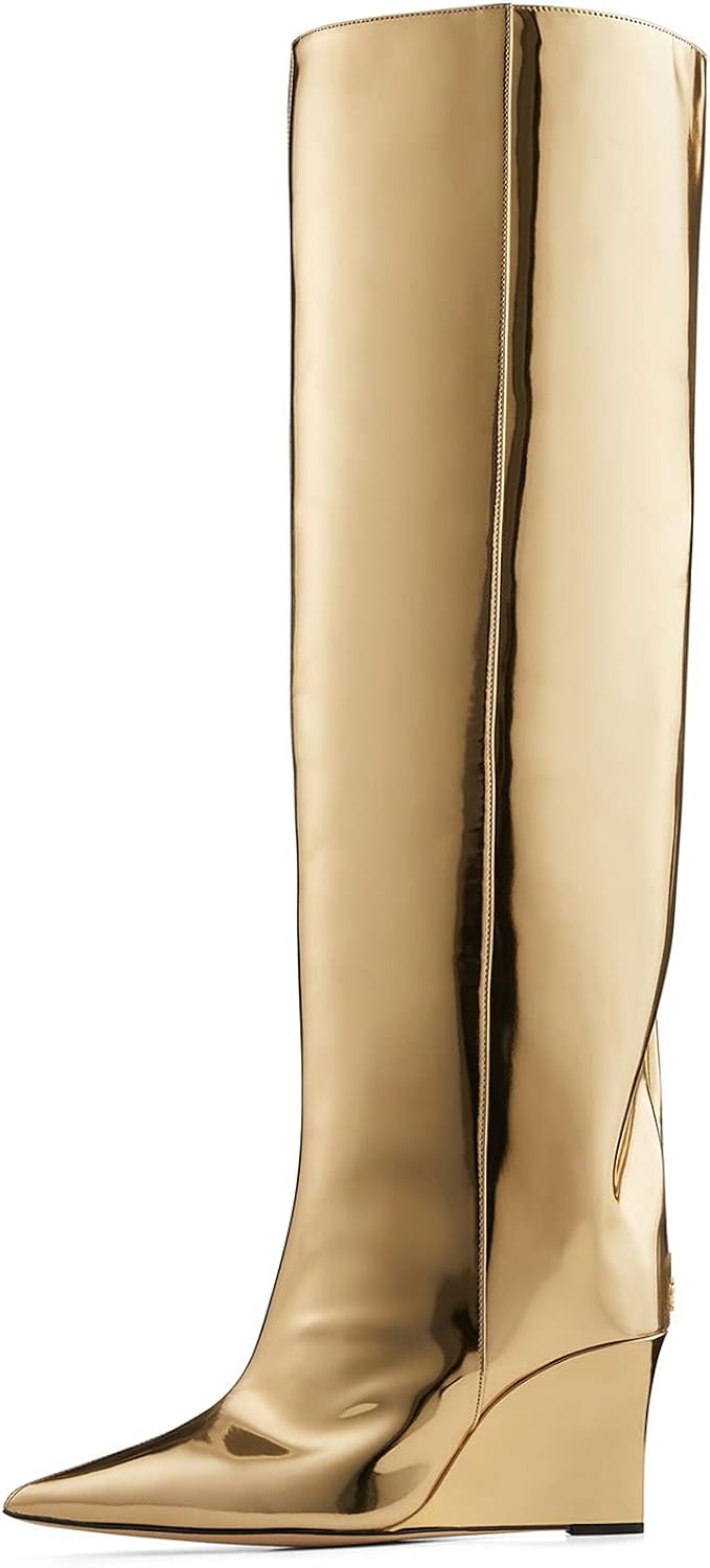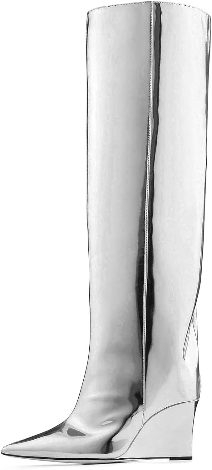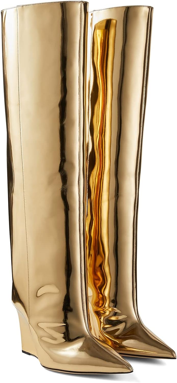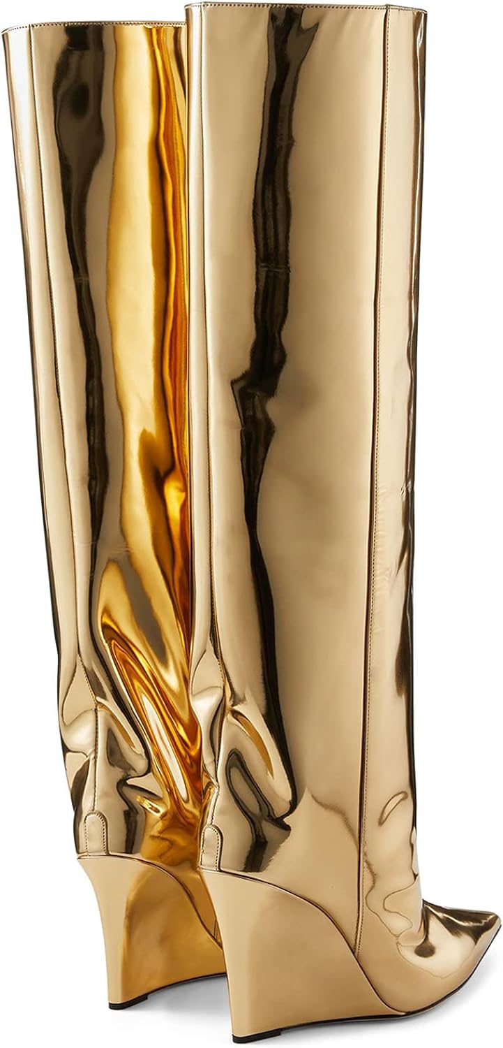 These Metallic Leather Wedge Heel Knee High Boots are crafted with fine metallic leather. providing a stylish look with reliable comfort. The wedge heel elevates this timeless design. creating a polished look you'll love for years. Add a touch of class to any outfit and experience the ultimate in knee-high boots.