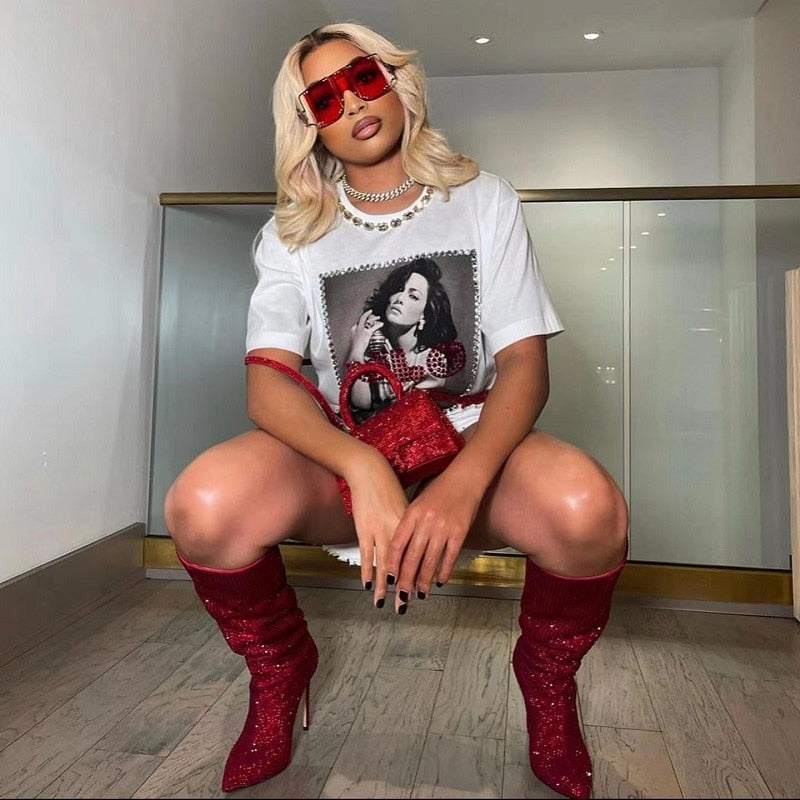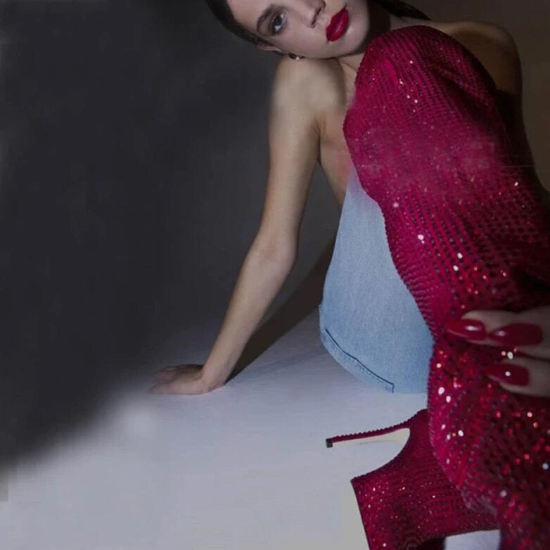 Lorena Rhinestone Sequin Knee High Boots - 7 Colors. Super sexy and trendy colorful rhinestone sequin slouchy boots with stilletto heels.