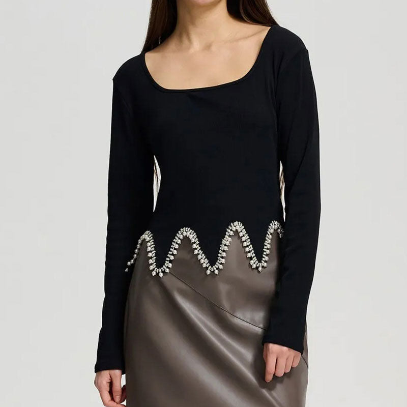 This knitted jumper from Foxsweaters arrives in a black hue and is further accentuated by a diamanté and beadwork trim at the curvy hem. adding a touch of bling to your everyday elegance. With its low square neckline and long sleeves. this timeless ribbed knit top is perfect for layering or standing alone to showcase its luxurious details. Pair it effortlessly with your high-rise pants or skirt to add a quiet touch of luxury to your entire outfit. whether you're heading to the office or out for a night on the town.