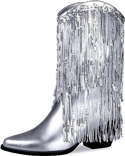 Step out in style with the Metallic Glitter Sequin Tassel Cowboy Boots. These sleek and stylish boots are crafted from a luxe combination of metallic glitter and sequins. and feature a beautiful tassel design. With a comfortable fit and fashion-forward style. these boots will help you make a statement. wherever you go.