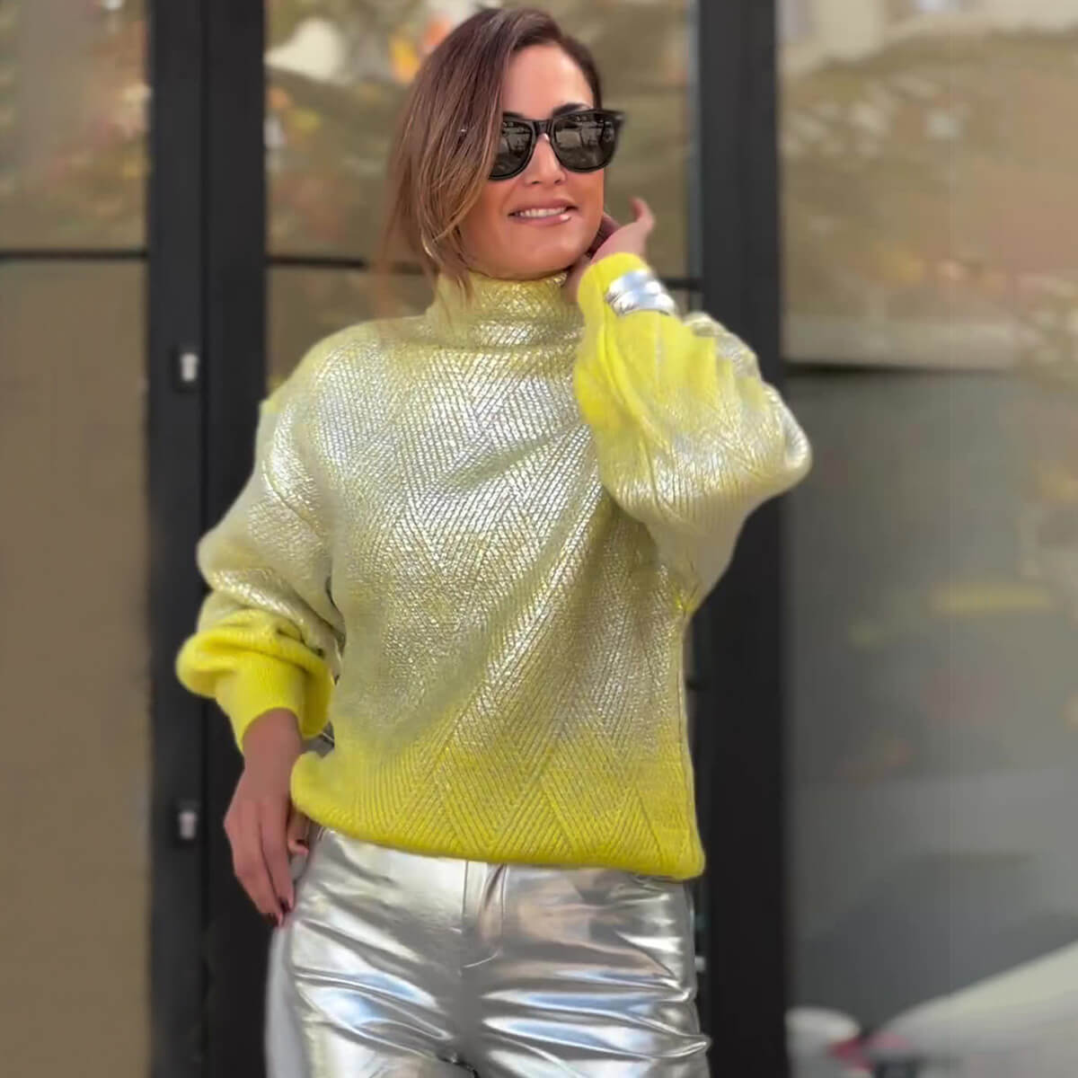 Glow up your wardrobe with our textured rhombus pullover sweater �radiate confidence in every step! Command attention in the spotlight with our metallic sweater. showcasing a captivating gradient effect. This turtleneck exudes sophistication with its long sleeves and ribbed cuffs. delivering a relaxed midweight knitwear ideal for any occasion. Choose from bright yellow or romantic lilac hues to suit your style. Effortlessly pair it with silver or gold metallic pants for a standout ensemble that demands admiration.