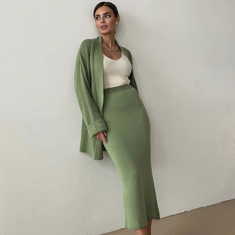 A mono-color set always wins. Your winter closet needs this two-piece knitwear. Made in a variety of colors. including black. off white. gray. green and khaki. the co-ord is a perfect combination of acrylic and cotton. offering you the best soft and cozy feeling to take you through the coming fall and winter. The cardigan is open to the front. featuring a loose silhouette with a drop shoulder. long sleeves and patched pockets; while the matching skirt showcases a minimalist fashion and is presented in a slim-fit until it finishes at the mid-calf length. No need to go match-matchy. Style this two-piece knit set with the matching knit top underneath. Simple. classic but chic and elegant!