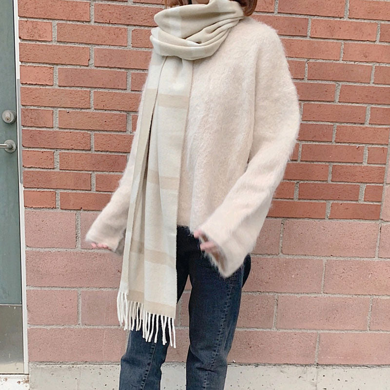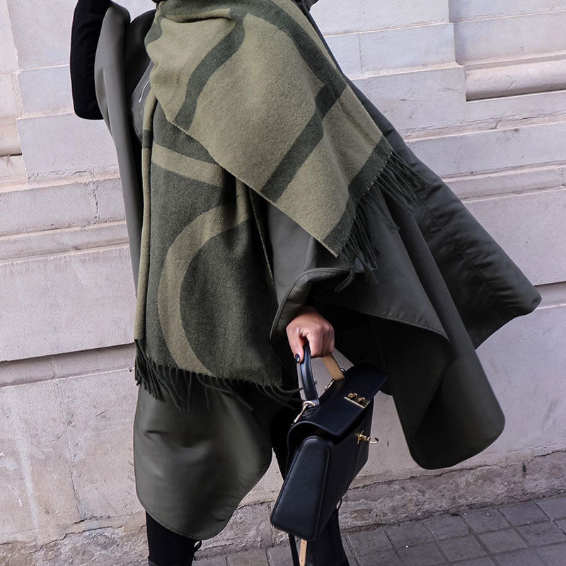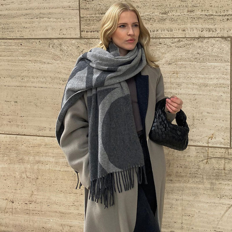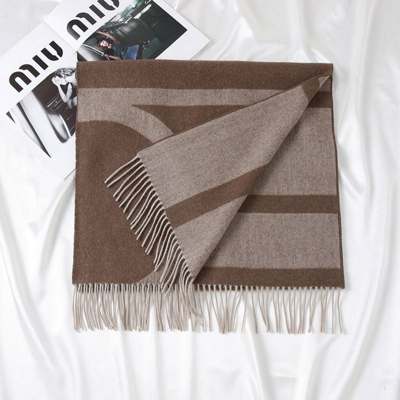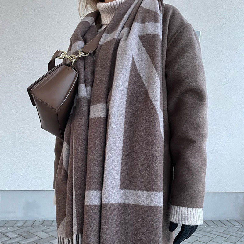 Our scarf is all about the cozy with elegance. This oversized knit scarf is a chic geometric intarsia knit with double-sided technique to give you all the luxury feel. The exquisite wool-blend knit makes this piece a super soft and warm winter accessory to add around your neck.The rectangular cut is finished with playful fringe ends. which is the best part that we love. Wrap it up with our knitted scarf and you will know how easy it is to keep cozy in style. Plus. it has a wide range of color options: coffee. gray. olive green and beige.