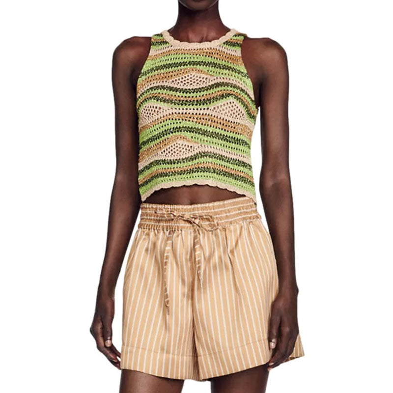 The colorful crochet knitwear in summer! This tank top is sure to be your new fave piece. Featuring an open crochet material with viscose in different colors. the top showcases wavy striped prints to lend you plenty of summer fun. The sleeveless top is cut above the belly button. which is trimmed with scalloped edges on the round neckline and cute crop hemline. The figure-hugging silhouette is ideal to wear in those sun-soaked summers. especially when paired with denim shorts and sandals. Get ready for the summer right now!