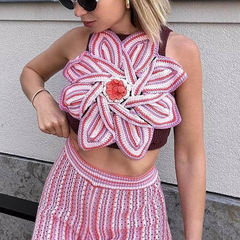 This cute sleeveless knit top captures the essence of '90s nostalgia. Combining this vintage feel with a modern boho touch. it features a beautifully crafted crocheted flower at the front. The high round neck adds a classic element. while the open knit pattern provides a breathable and airy feel. This cropped top comes in a rich chocolate brown color. making it versatile and easy to pair with various outfits. Whether you're going for a casual day out or a chic bohemian beach look. this knitted rosette top offers a unique blend of retro charm and contemporary style.