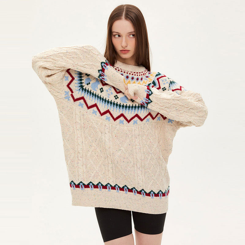 Playful with a unique festive look. the crew-neck sweater is crafted from polyester-blend knit with multicolored heathered jacquard construction for a delightful completion. Cut in an oversized silhouette with raglan sleeves. the pullover has a fair-isle patterned yoke and chunky cable textures. making for a unique twist on the Aran style and Nordic look. Designed for the winter holiday coming. this relaxed sweater will keep you joyously warm during the happy moments with family or friends. Make it simple and casual by pairing with leggings and sneakers.