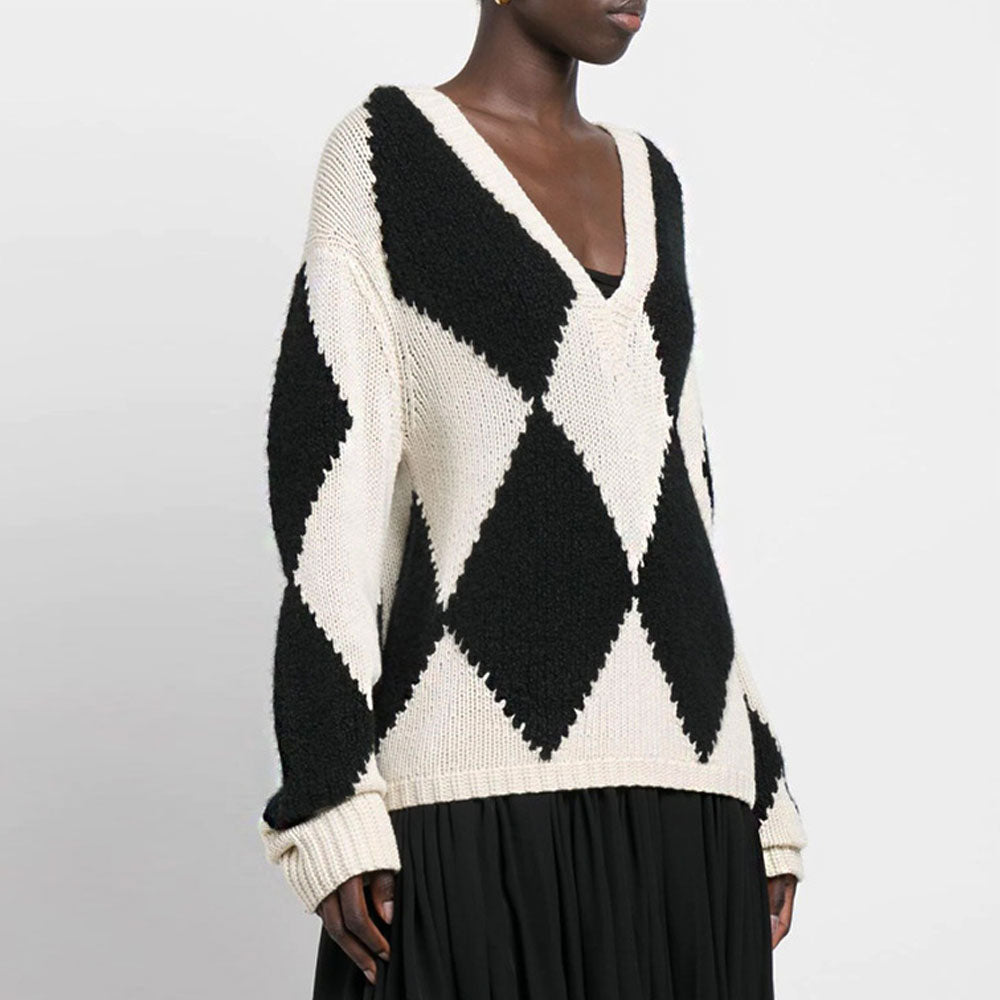 Diamond sweaters turn up the preppy volume for Fall-Winter. Our pullover sweater is a fully fashioned piece with dropped shoulders and V-neckline in a contrast harlequin-argyle jacquard knit construction. The unisex oversized sweater is made from synthetic fiber of acrylic. polyester. nylon and PBT material that allows for hand-washed only. It has elongated trims that feature signature fisherman's rib stitching for added shape. The classic contrast Black and Beige color makes it a versatile layering piece over your collared shirts by pairing with a pleated skirt. crew socks and loafers.