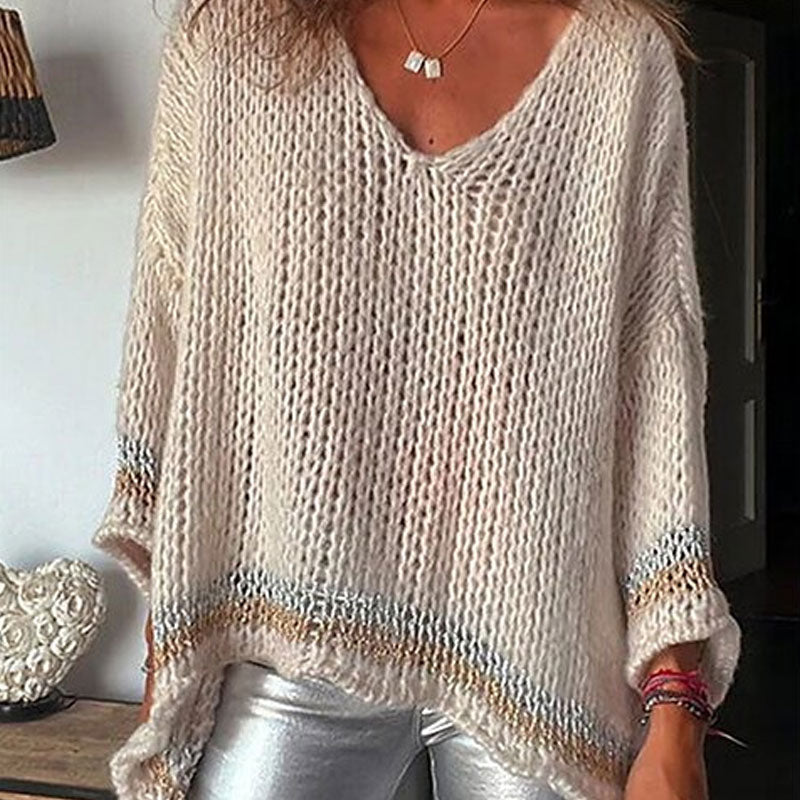 Oversized and effortlessly chic. this sweater is designed in a open knit and the relaxed silhouette fits most of the body shapes with a comfy soft handle. Crafted with polyester knitted material for those transitional seasons. the casual jumper is cut in an easy pullover style. featuring a V neckline. long sleeves. drop shoulders and an asymmetric high low hemline. It has striped piping on the hem and cuffs which pops up a little fun. Available in apricot and gray hues to choose from. this sweater is easy to pair and easy to style. with simple skinny pants and you are good to go.