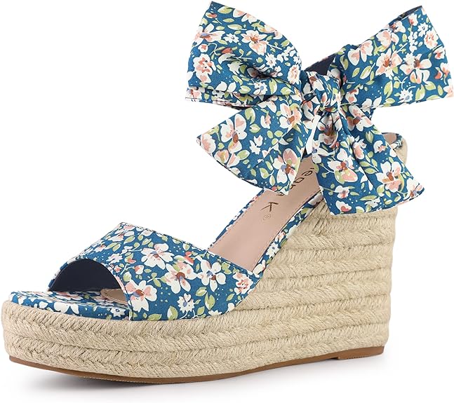 • Platform. Floral Printed. Wedges Sandals. Open Toe. Slingback. Bow Decor. Espadrille Heel