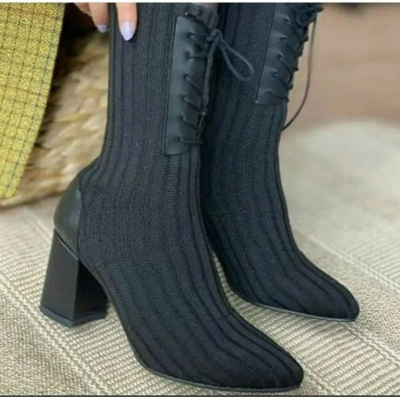 IFOMT - Pointed Chunky Heel Boots Black Surname High Lace-up Knit Sock Boots Plus Size 43 Non-slip Banquet Boots Thigh High
