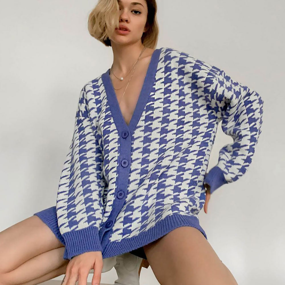 If houndstooth pullover isn't your thing. try on this buttoned winter cardigan with a strong college-inspired vibe. Due to its classic duo-tone pattern modernity. this preppy style knitwear has a timeless appeal that will never go out of style. This chic oversized cardi is intarsia-knitted with an all-over houndstooth pattern from mid-weight acrylic blend. detailed with a V-neck. a single-breasted placket. and dropped shoulders along the loose-fit long sleeves. And the extra elongated length enhances the academic vibe. Pair it with a mini leather skirt and over-knee boots for a model off-duty look.