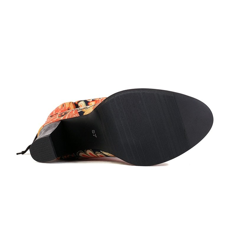 Rael Printed Tie and Slouchy Over the Knee Boots - 3 Styles. High fashion 80s look all over prints boots with puffed shape and lace ties details. Runway look all over. these over the boots need to be on the street. right now. Choose Prints - Skull & Rose or Vintage Paisley. or classic Black Leather. Handmade. 8cm heels.