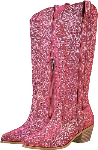 Add some sparkle to your outfit with these Rhinestone Knee High Sequin Cowboy Boots. Featuring a bold upper with rhinestone accents and a sequin heel. they are sure to upgrade any look. With a timeless design. these knee high boots provide both style and comfort.
