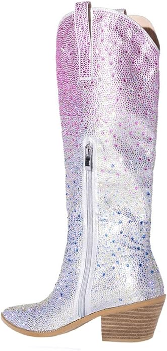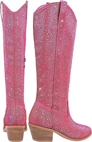 Add some sparkle to your outfit with these Rhinestone Knee High Sequin Cowboy Boots. Featuring a bold upper with rhinestone accents and a sequin heel. they are sure to upgrade any look. With a timeless design. these knee high boots provide both style and comfort.