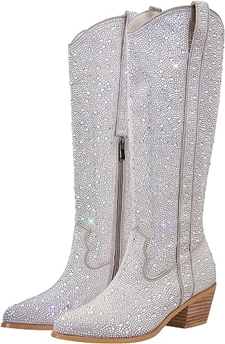 Rhinestone Knee High Sequin Mid-silver Cowboy Boots