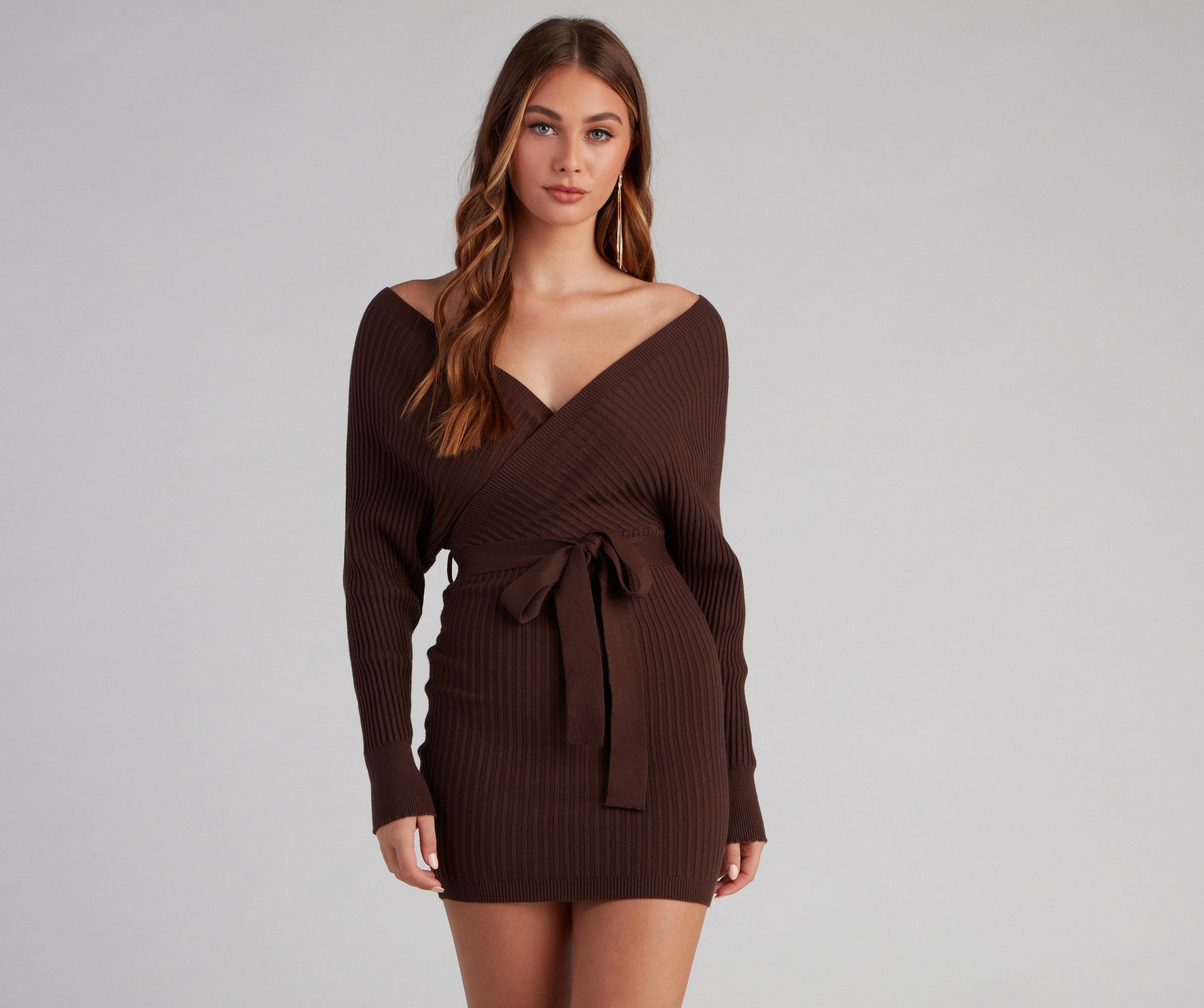 Update your everyday mini for the winter season with this adorable ribbed knit sweater dress! It features a wide V-neckline that can be worn off the shoulder. a wrap front and back. a tie-front detail. and a short. curve-hugging silhouette. Pair this dress with thigh-high bootsfor a chic casual vibe.