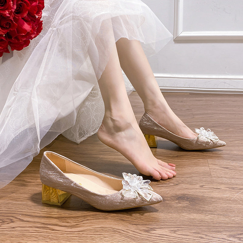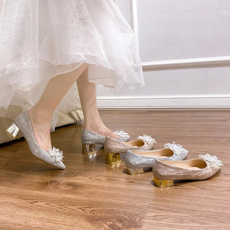 Elegant Crystal Flower Bride Shoes Women New Bling Bowknot Med Heels Pumps Woman Slip-on Thick Heels Wedding Shoes