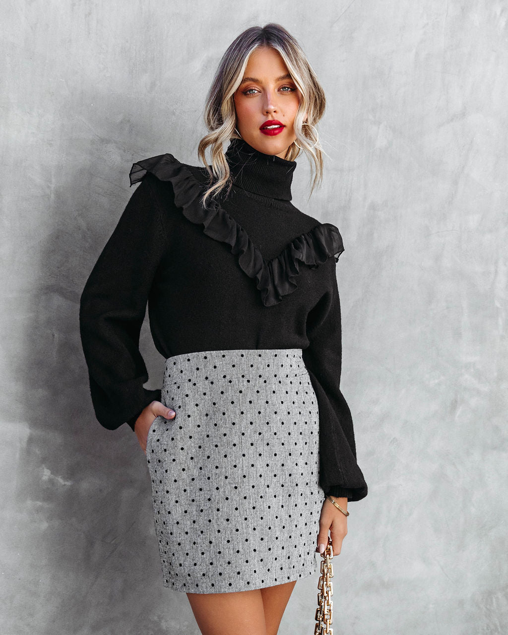Chic meets festive in the Serving Looks Polka Dot Pocketed Mini Skirt in grey that features a structured waistband.