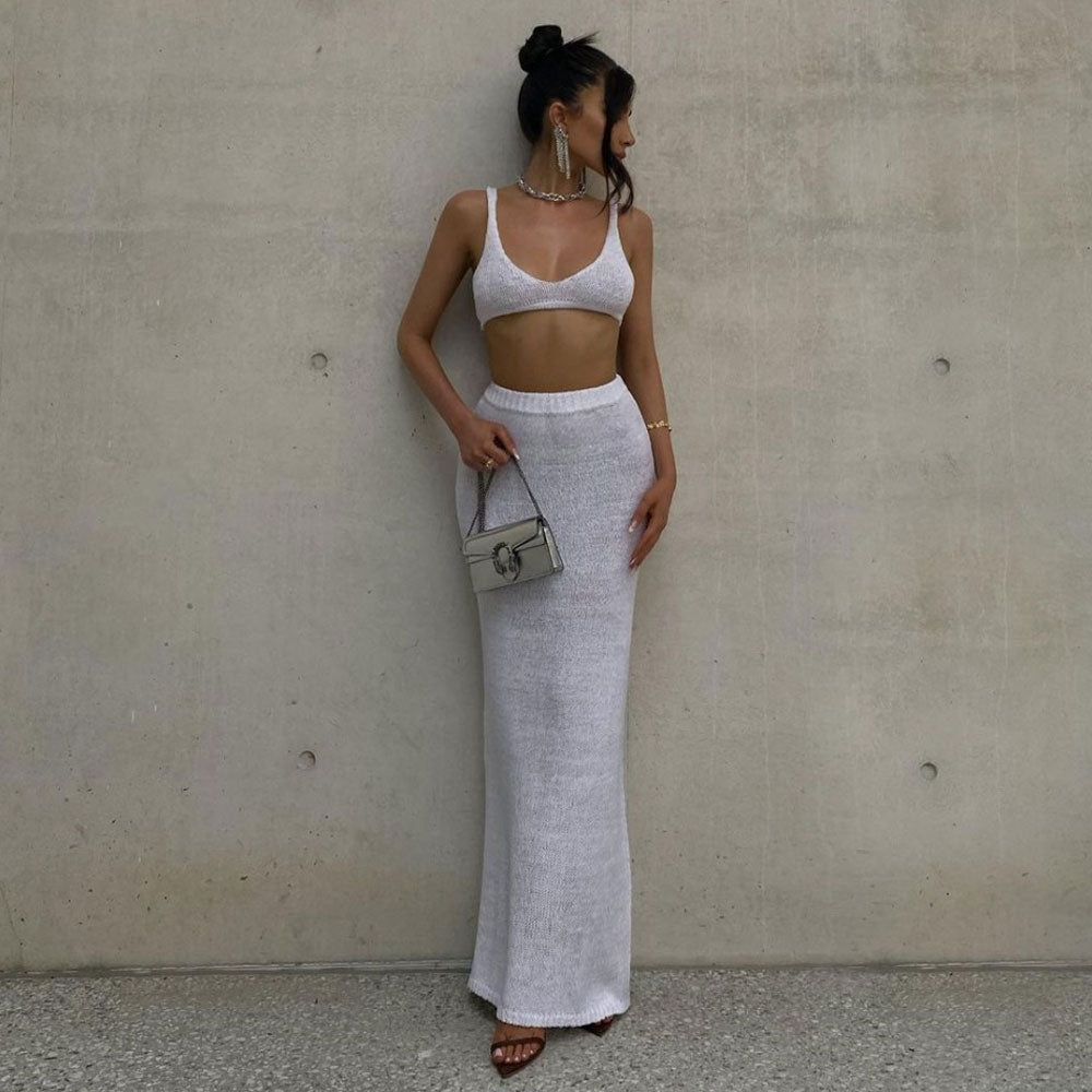 Master the art of holiday chic with our captivating two-piece knit set. Showcasing a flattering scoop neckline and secure fixed shoulder straps. the knitted bralette top creates an elegant silhouette perfect for festive occasions. The slip-on design ensures easy wear. while the cropped fit of the knit bra effortlessly pairs with the high-waisted maxi knit skirt. featuring a comfortable elasticized waistband. Delicately imbued with a touch of sheerness and boasting a full-length design. this ensemble radiates enchanting charm. perfectly suited for the holiday season. Whether you're celebrating with intimate gatherings or stepping into glamorous holiday parties. this coordinated masterpiece seamlessly merges sophisticated design and comfort.