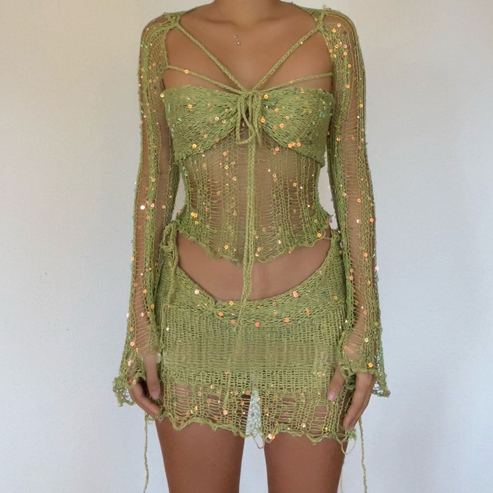Covered in dazzling sequins from top to bottom. this sparkly distressed crochet knit ensemble features a semi-sheer laddered knit three-piece. The crop shrug boasts wide-cuffed long sleeves and front strings tied at the darling sweetheart neck tube top. Paired with its roll-trim low-waist bodycon mini skirt. complete with a waist tie. it's the ultimate club party arsenal for your summer adventures. Celebrate on the beach party with this distinctly free-spirited feel knit set.