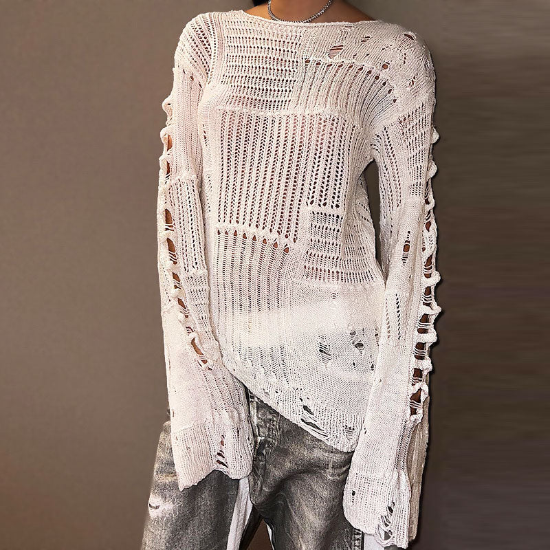 90s grunge distressed sweaters have become the cool-girl staple for a reason. as they work for every occasion. The lightweight knit is made in a loose-fitting silhouette with allover ripped detail creating a sexy see-through effect. It's breathable but still over a bit of coverage for those cool. windy nights. Featuring a boat-neck design. the sheer knit flatter its hemline finishing just below the bottom and skimming the hip. Embrace the cool street-style energy by pairing it with a tonal bra top and low-slung jeans for a relaxed sensuality.