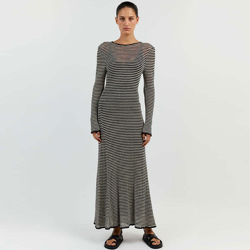 Summer elegance is defined by this black and white striped dress. Boasting a round neckline. graceful long sleeves. and an enchanting open-weave pattern. this quick-dry mermaid tail knit dress is further enhanced by an adjustable tie closure at the back. ensuring an elegant and customized fit that prioritizes your comfort. Embrace the opportunity to make a lasting impression with this timeless garment that effortlessly radiates opulence and sophistication.