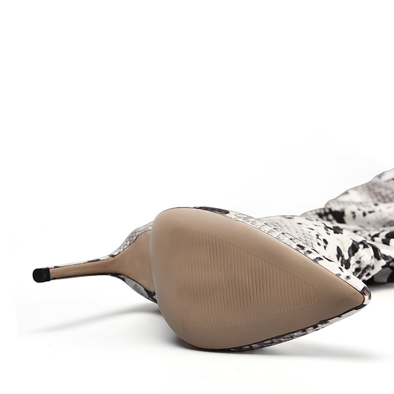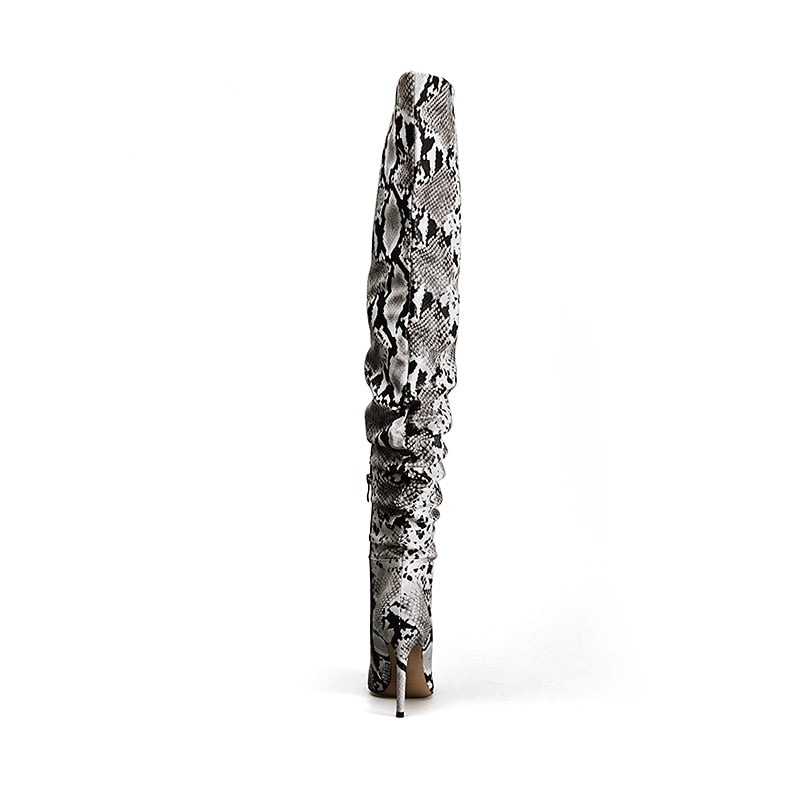 Slouchy Thigh High Snakeskin Print Boots. Super sexy over the knee boots with slouchy feature and trendy white snakeskin prints. Perfect over jeans or with any length of skirts or dresses. these boots look amazingly hot and fashion forward. Faux Leather. Hand made. Ships 3-4 days from ordering.