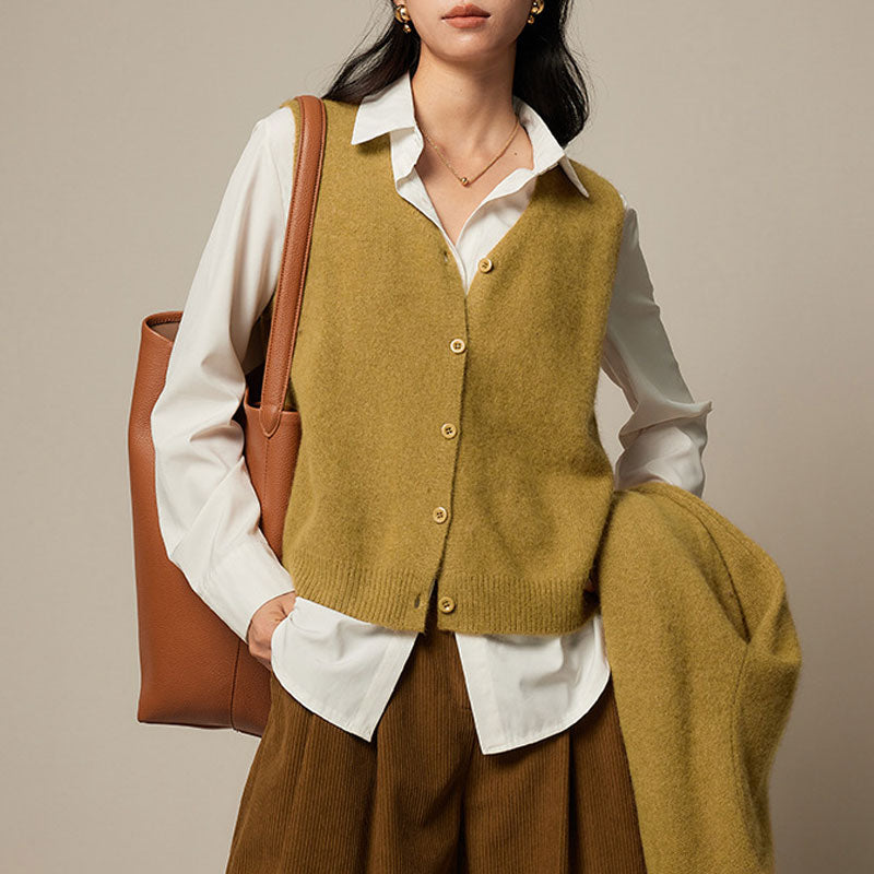 Feed your winter wardrobe with this sleeveless knitwear. Hued in a wide range of monochrome color to suit your taste. this sweater cardigan takes a simple style with a V neckline. sleeveless design and a button front closure. It's ribbed along the hemline to create a sophisticated look. Made of cotton blend. the soft knitted top feels soft and fuzzy to the touch. giving out a sense of luxury quiet vibe. Go mix-and-match with basic sweater and overcoat. add a leather belt on the waist to enhance the fit. Exquisite and luxurious. yet with affordable price.
