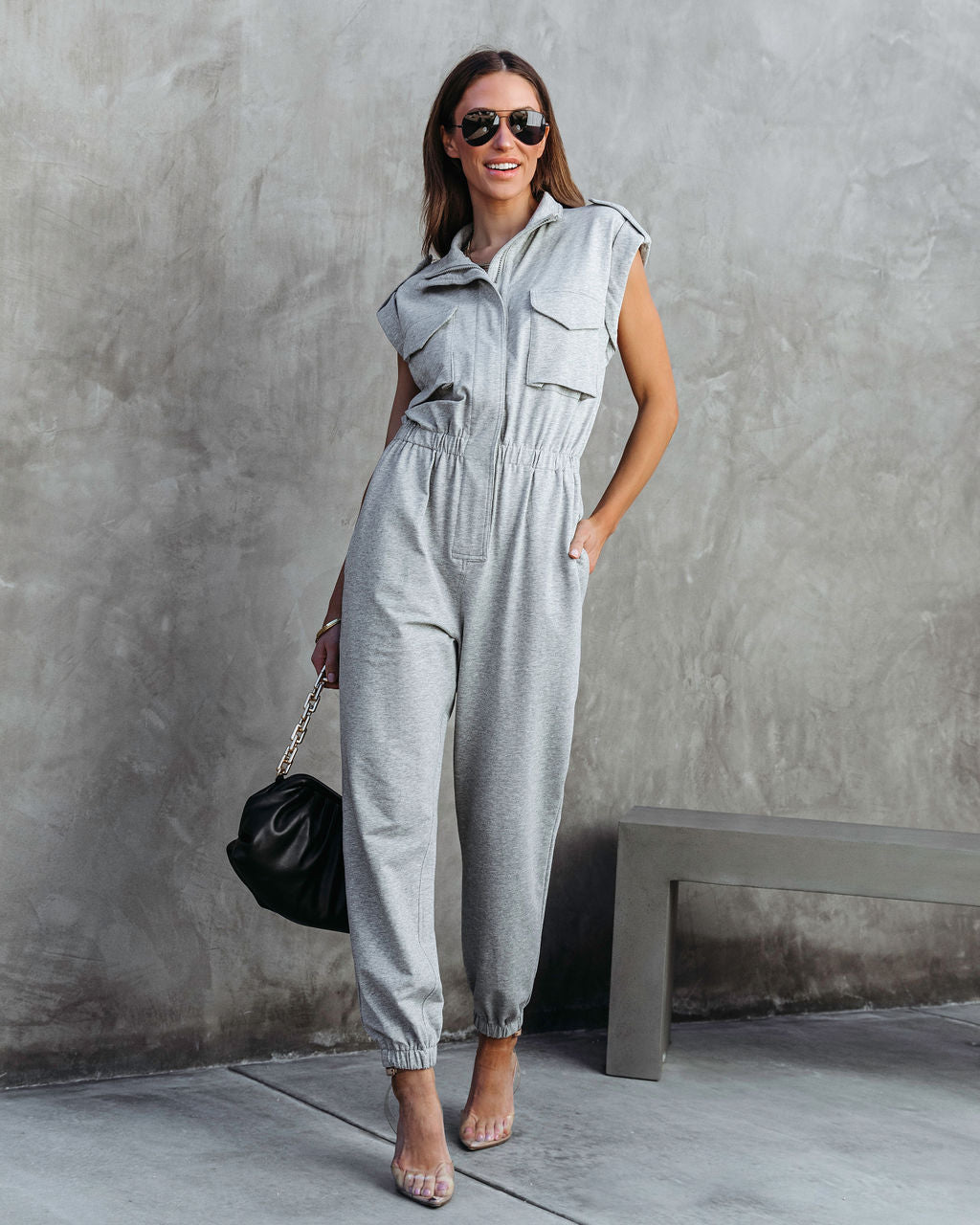 Trendy babes will love the Stronger Than Ever Pocketed Jumpsuit in heather grey that features an elastic waistband.