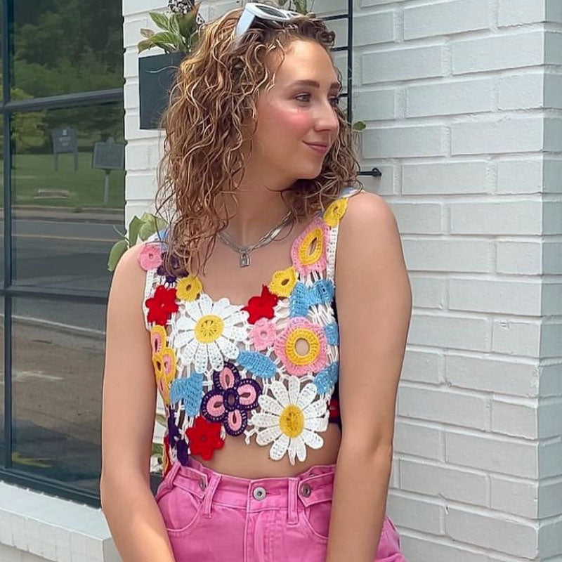 Retro crochet pattern is having a renaissance this season! Crafted with care. this cropped top features a U-shaped design that flatters your neckline and enhances your summer glow. The multicolor flower pattern adds a vibrant and playful element to the overall look. Made from open-knitting crochet material. this sleeveless top offers a comfortable and breathable fit. keeping you cool during hot summer days. The uneven hemline adds a unique twist. giving it an edgy and modern vibe. This colorful floral tank top is a fashionable piece. perfect for adding a touch of bohemian flair to your summer wardrobe.