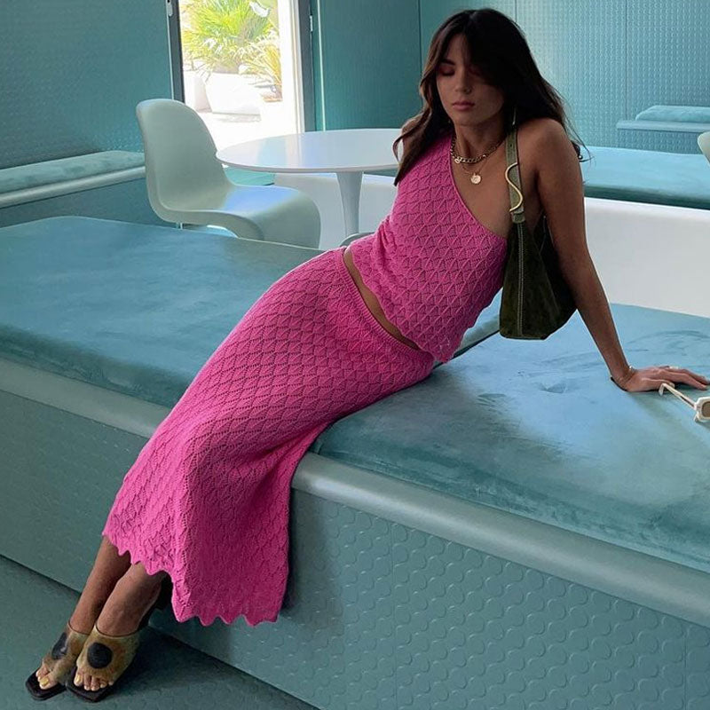 This hot-pink knit set channels a modern bohemian mood with the intricate pointelle stitching construction. If you're looking for your next vacation outfit. then look no further. Made with the soft. springy cotton-blend yarns for a comfortable fit. the knit set is a little sheer with the loose knit and features a cute cropped sleeveless top that's designed with the asymmetric one-shoulder silhouette. While the matching skirt is detailed with the elastic waist and a column profile that skims through the hip and thigh which ultimately finishes with the scalloped hem for a fun mood-boosting. Wearing it as a cover up atop your favorite bikinis is a great choice for the beach vacation.
