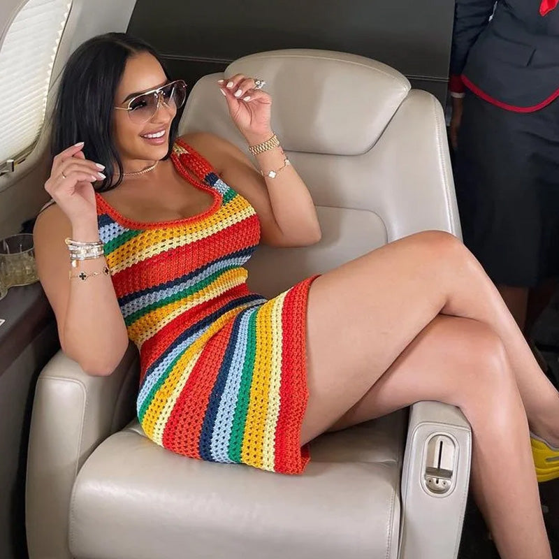 Catch the rainbow with our go-to dress for sun-kissed elegance! Step into effortless style with our pull-on knit dress. crafted from a blend of polyester and elastane for the perfect fit. Featuring vibrant rainbow stripes all-over and stretchy shoulder straps. this dress is perfect for vacation vibes or a resort getaway. This breathable sleeveless mini dress transitions seamlessly from beach to bar. With its crochet knitted design. embrace sunset-to-sundown elegance and turn heads wherever you go. Whether you're lounging by the pool or dancing the night away. this dress is your ultimate summer companion.