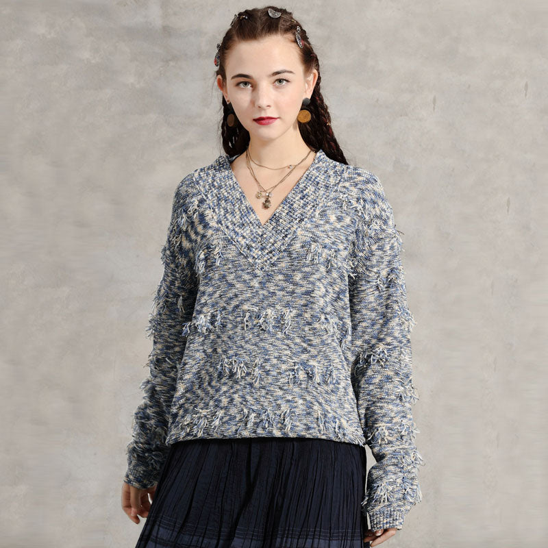 Best sweater ever! No outfit is truly complete without this sweater in your winter styling. Comfy stretch knit. with a heathered effect throughout. shapes this relaxed sweater that has numerous tassel flowers for added dimension to your look. The loose-fitting silhouette has a V-neck and ribbed trims alongside the neck. cuffs and hemline for a fitted comfort. With the ability to style with everything in your wardrobe. the marled knit creation is in an acrylic-spun bringing out the textures that you'll love. Take styling inspiration from the model and match it with a skirt and boots.