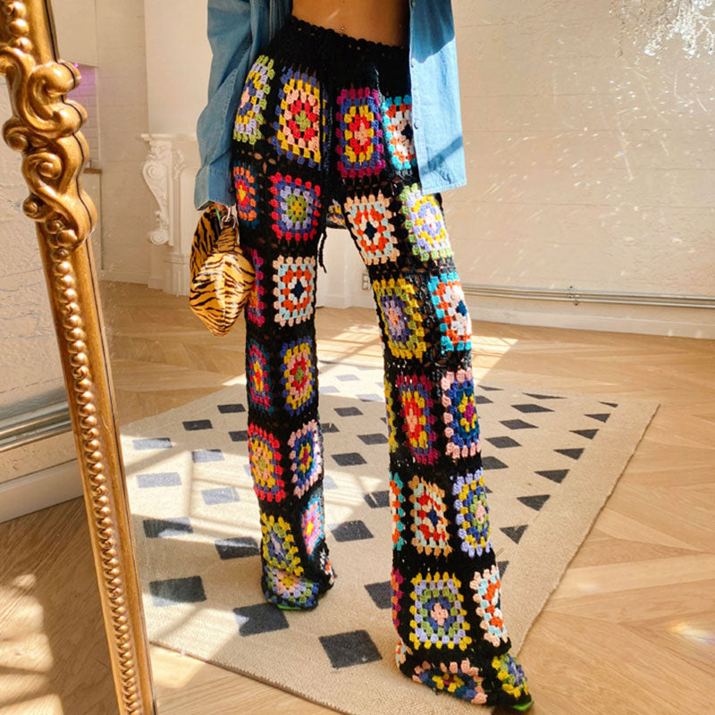 Our designer knit pants are a versatile day-to-night vacation option that'll take you from the beach to bar. Designed to be slipped on over bikini suits. or worn with neutral undergarments. these crocheted pants are constructed with breathable cotton-blend material to make it breezy and comfortable. The beautifully crafted granny square pattern is sure to add a sense of chic bohemian style. It features a drawstring waist to tie the front that defines the waistline. Jump on the boho trend early with one of these colorful options between black and coffee with our crochet knit hats.