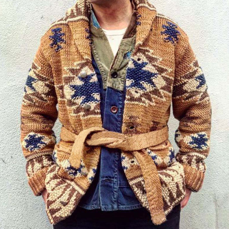 The best men's cardigan ever in this season. Knitted with heavyweight acrylic-blend fiber around 2.2 lbs. this winter cardigan sweater is an oh-so perfect casual street wear that features a smart shawl collar and a row of metal buttons to the front with a matching belt to tie on the waist. It also has two patched pockets on the side. The most beloved geometric jacquard design makes this piece a top level of men's winter fashion and will look just as good worn with jeans and a collarless shirt as it will with a tweed suit.