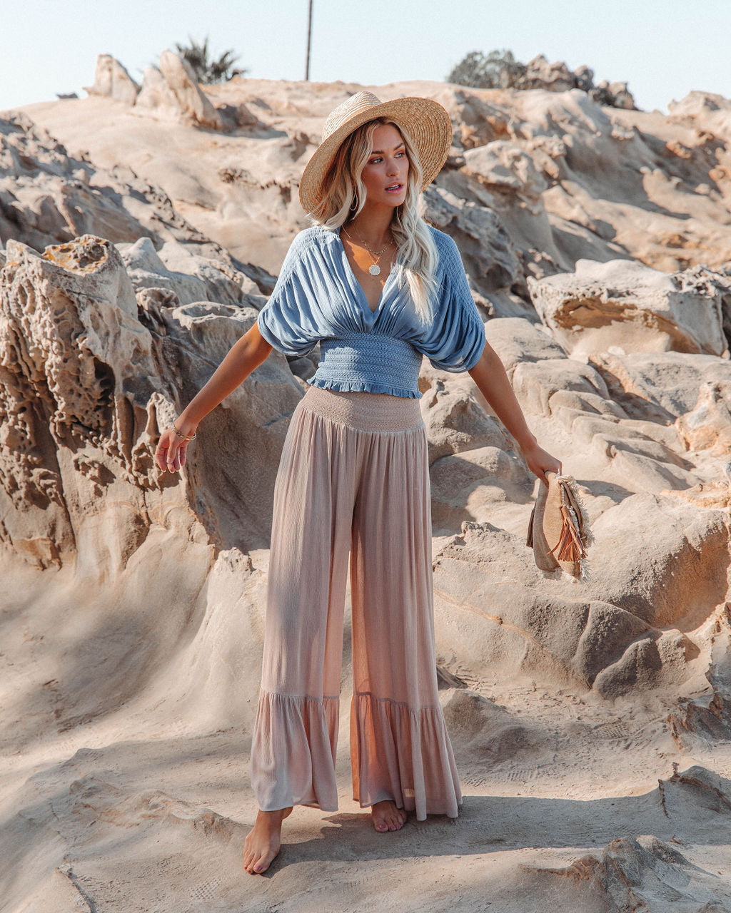 Beachy and breezy. the Wildflower Smocked High Rise Woven Pants in taupe feature a ruffle pant hem.