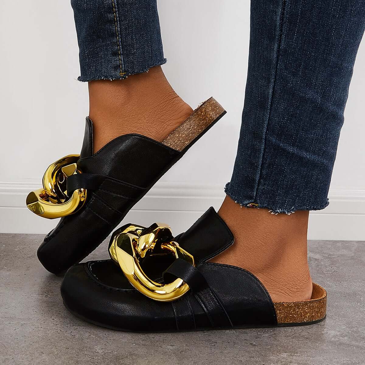 Style: Cork Footbed Slip-on Sandals with chain decor